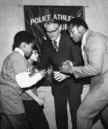 Joe Frazier (right), who received his first boxing lesson in a Police Athletic League ring, poses with PAL members and Police Commissioner Joseph O’Neill in 1972. (Special Collections Research Center, Temple University Libraries)